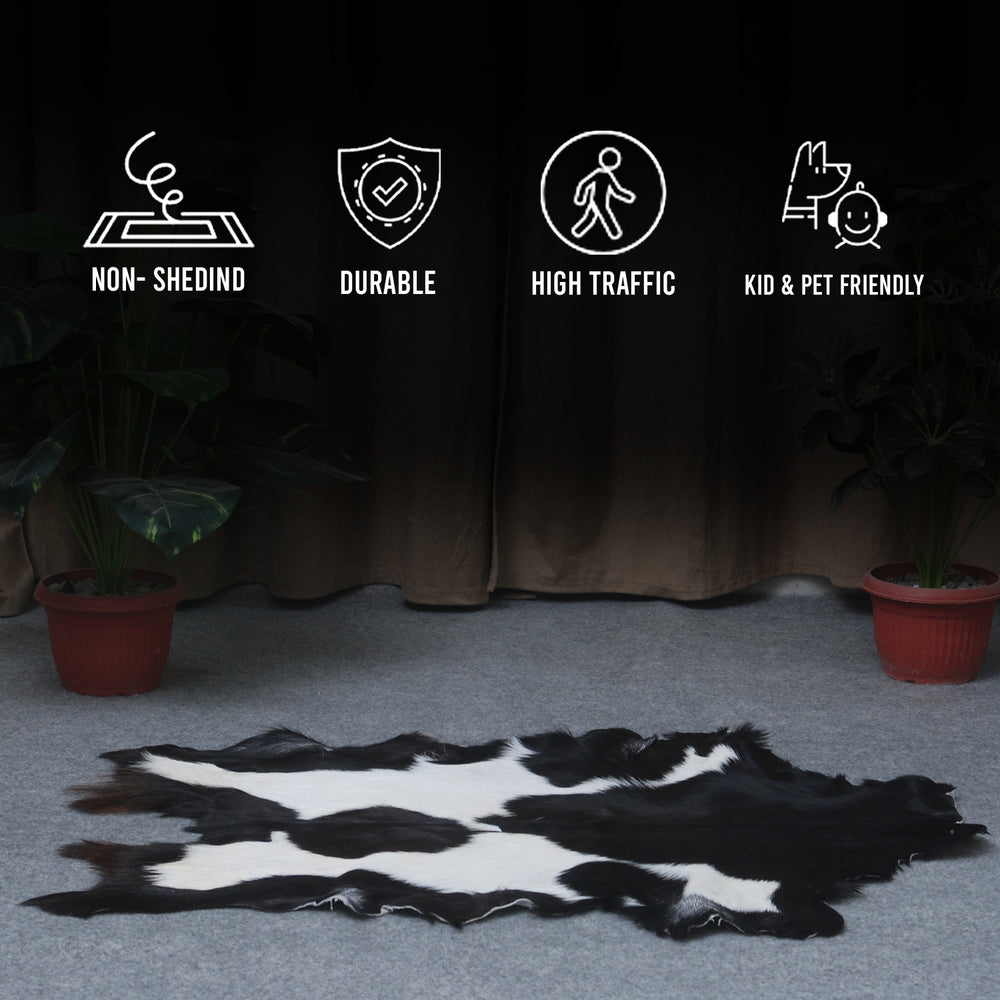 Elevate your room’s aesthetic with our eye catching black and white Goat Skin Rug. Its bold graphics design exudes modern sophistication and adds a touch of elegance to any décor. Soft and gentle on the Goat skin rug, it’s also kit and pet friendly, making it a practical choice for any household. Plus, its hypoallergenic and non- shedding properties ensure a lifetime of effortless style.