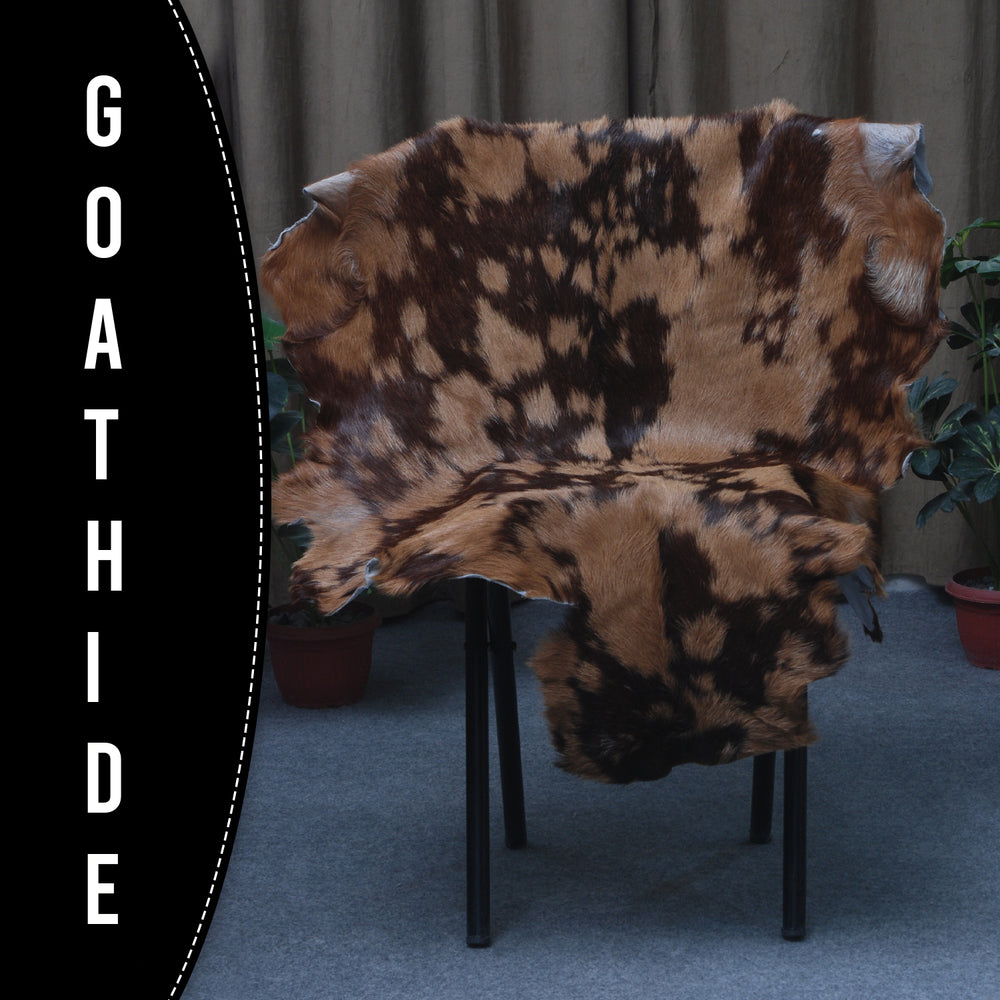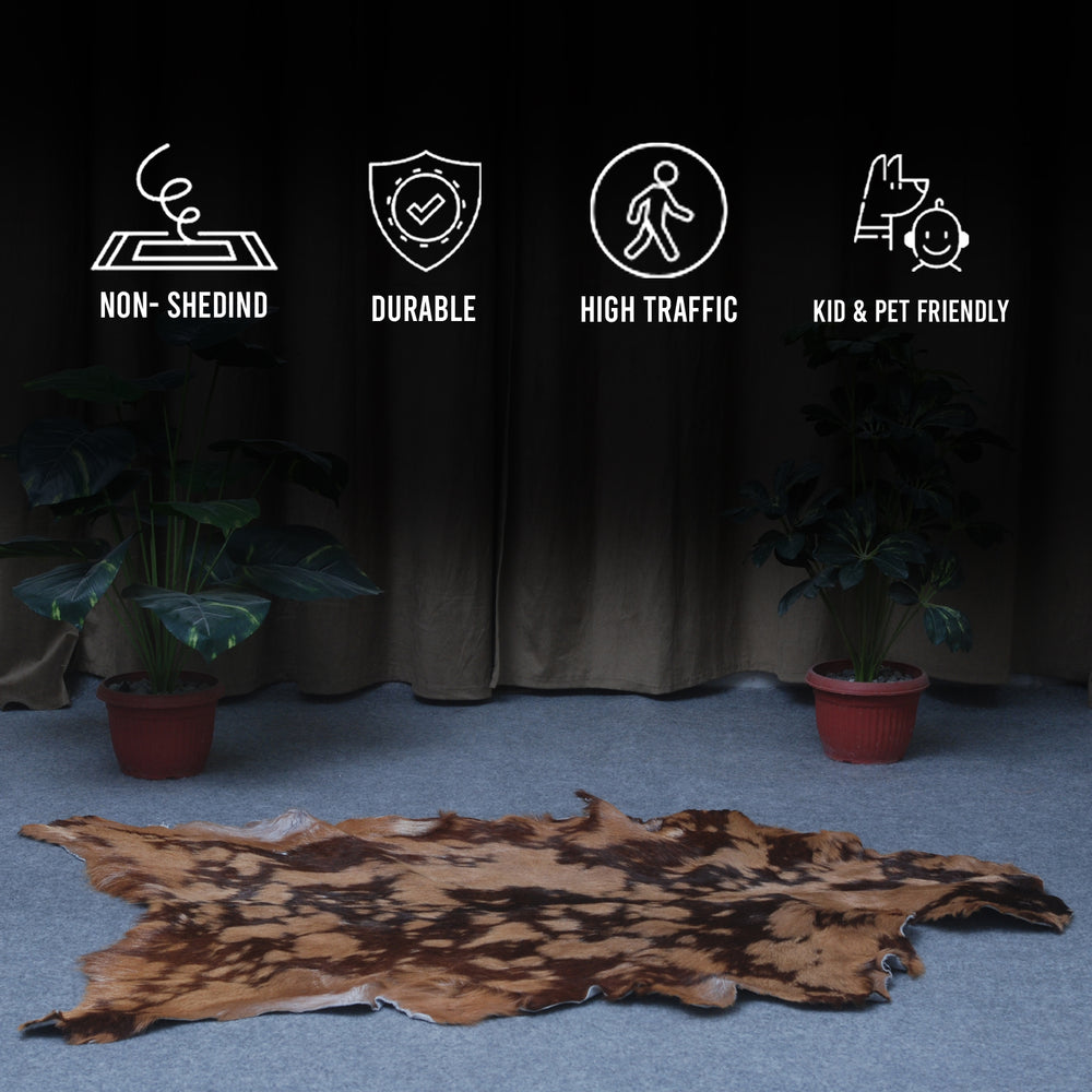 Elevate your room’s aesthetic with our eye catching brown and black Goat Skin Rug. Its bold graphics design exudes modern sophistication and adds a touch of elegance to any décor. Soft and gentle on the goat skin rug, it’s also kit and pet friendly, making it a practical choice for any household. Plus, its hypoallergenic and non- shedding properties ensure a lifetime of effortless style.