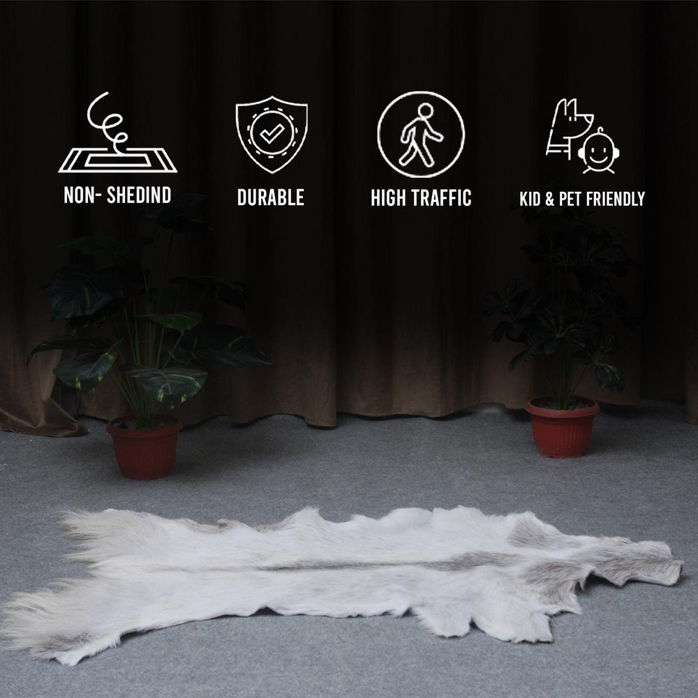 Create a calming ambience with this soft grey & white goat skin rug. The serene colour combination adds a touch of tranquillity to your space.