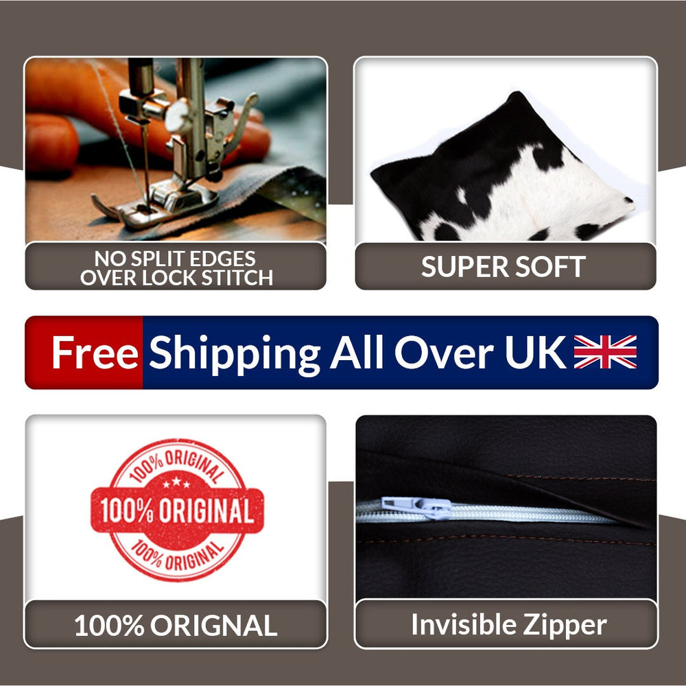 These stunning cowhide cushion covers are the perfect way to elevate your sofa, armchair, or bed. They also make a thoughtful and unique gift for any occasion. Please note that due to the natural variations in cowhide, each cushion cover will have its own unique pattern, making it a truly special piece.