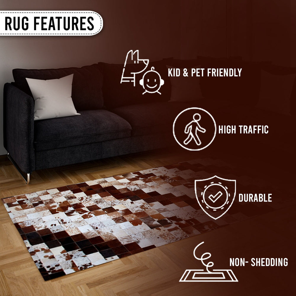Add a touch of luxury and personality to your home décor with this handmade cowhide patchwork rug. Made from real cowhide leather, this rug features a unique combination of small cowhide pieces and finished leather, creating a striking design that is sure to impress.