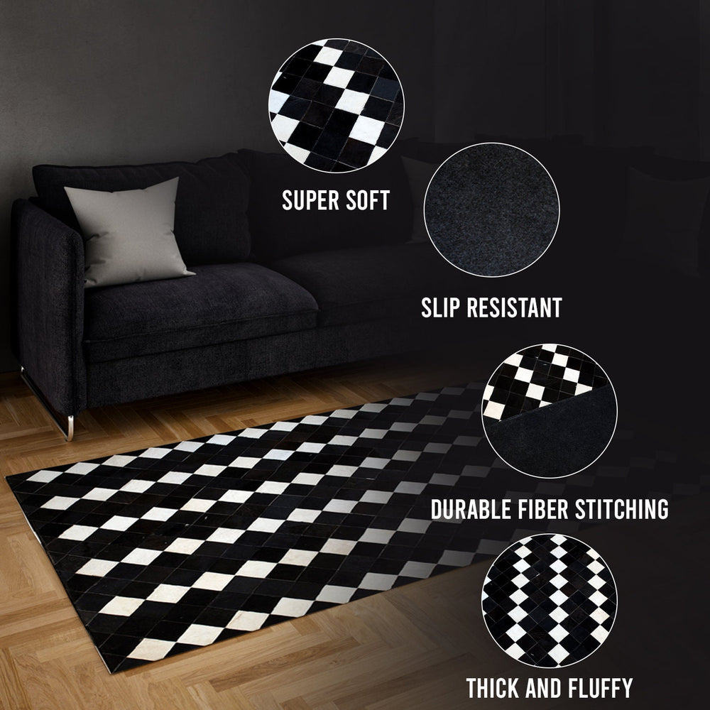 Don't miss out on this unique and functional cowhide patchwork rug - a perfect choice for adding a touch of luxury to your space!