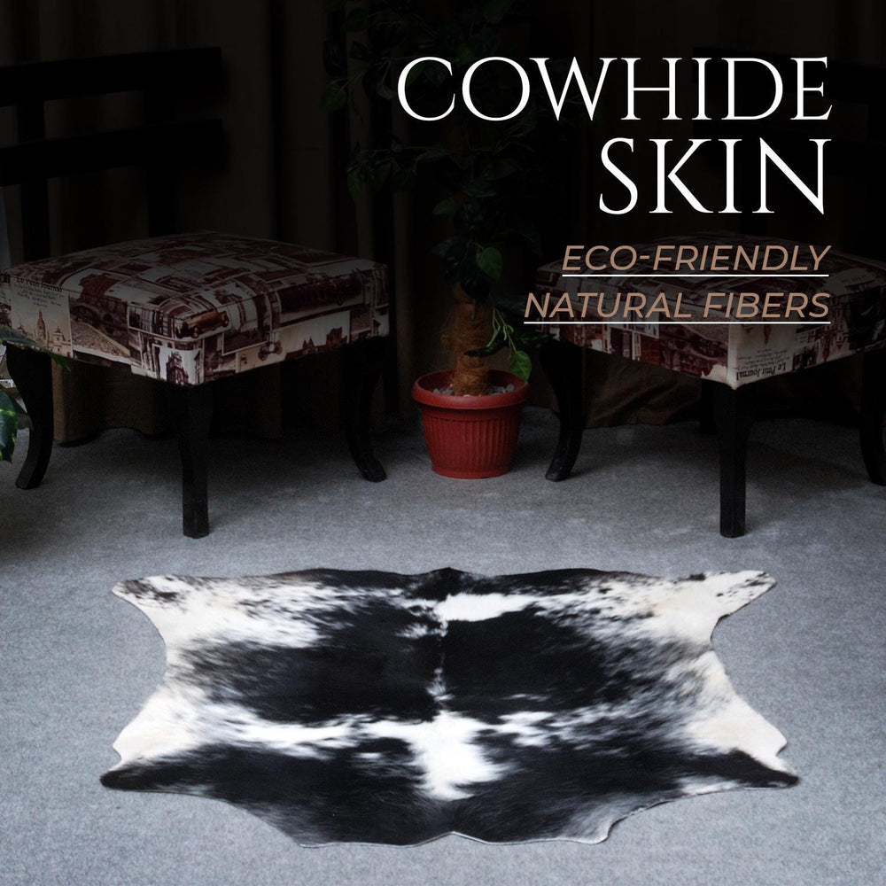 Add a touch of luxury and uniqueness to your home with our Small Black and White Natural Pattern Cowhide Rug. Each rug is 100% genuine cowhide, showcasing its one-of-a-kind pattern. The size of each rug is small, approximately 10 to 15 square feet, with detailed dimensions shown in the pictures.