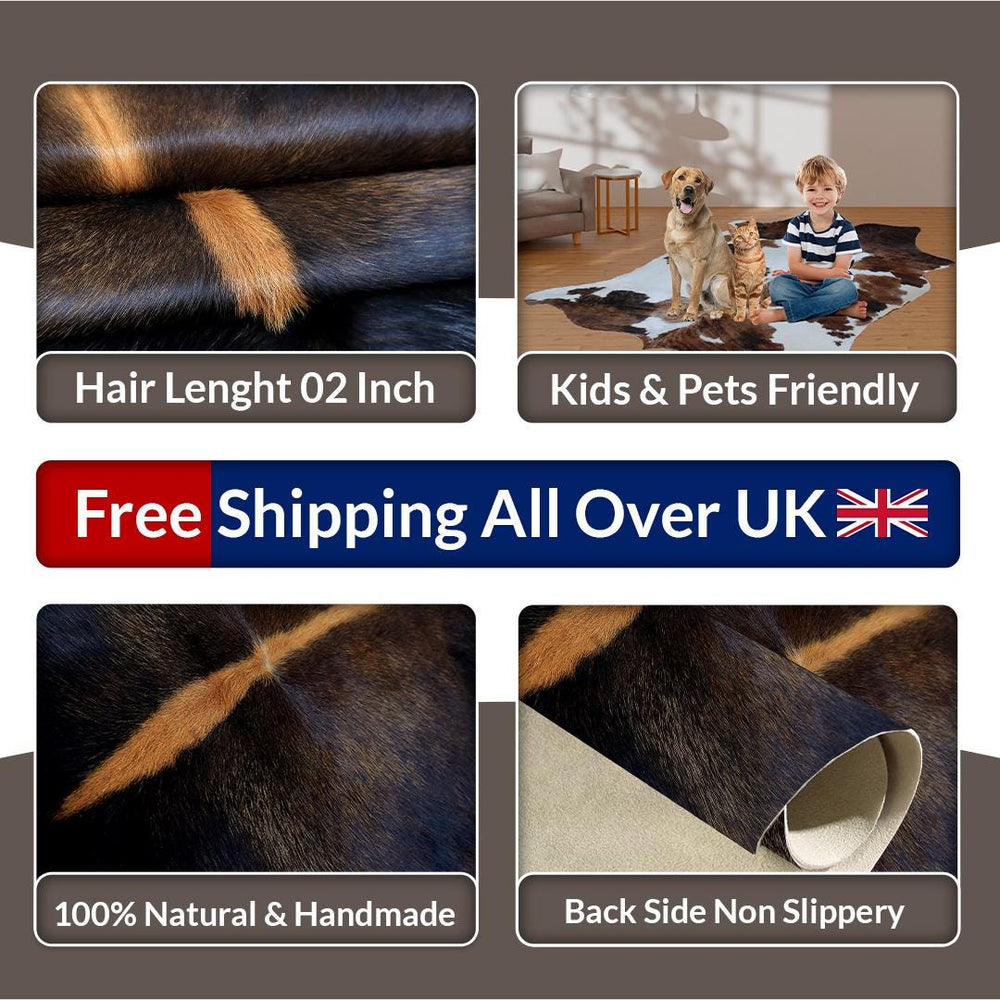 We handcraft our stunning Cowhide Rugs from 100% natural hides, meticulously sourced from the world's finest tanneries. Indulge in the soft, low pile and natural sheen that adds a touch of radiance to your space. The actual cowhide is photographed and shown in the picture. These are 100% pure natural cow skin rugs so that each cowhide rug is unique. Our cowskin rugs are unique and versatile. These area rugs are extremely durable, adding a touch of elegance, luxury, and warmth wherever they are placed in your bedroom or living room.