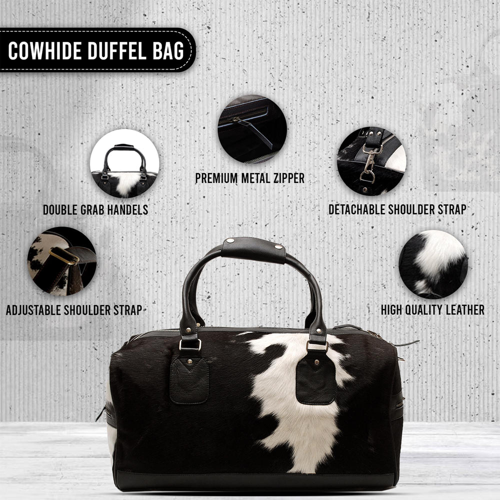 Experience handcrafted luxury—order your exclusive Cowhide Duffle today!