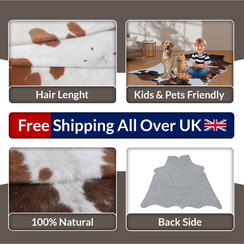 Take advantage of our FREE SHIPPING all across the UK and bring home a brand new, top quality cowhide rug today! Keep your rug looking fresh and clean by vacuuming or shaking it out regularly, and treating any stains immediately. Order now and elevate your decor with a touch of sophistication and warmth!
