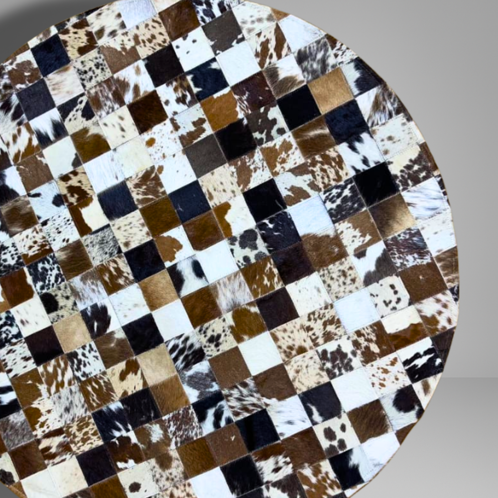 Experience refined craftsmanship with the Celestial Round Cowhide Patchwork Rug, designed in micro-patch square style for a luxury mosaic texture. Each small square of natural hair-on cowhide is individually selected, hand-cut, and stitched to create a unique, premium hide surface with rich organic character.