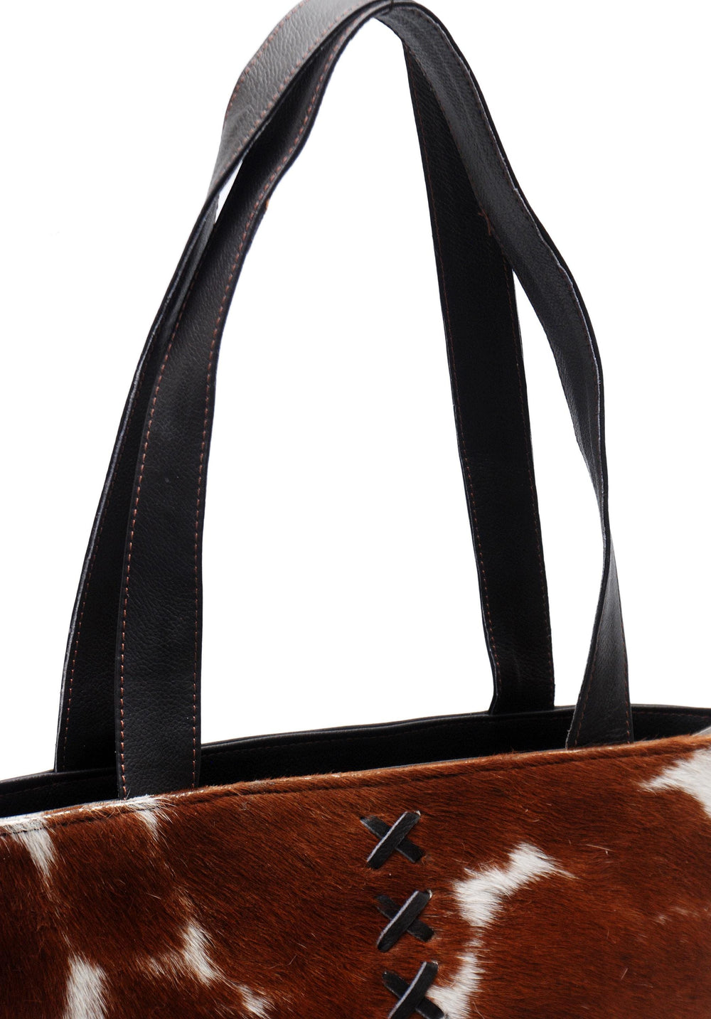 Composition: 100% genuine cowhide exterior, this 100% handmade cowhide shoulder bag is made in South Asia. The bag features a classic brown and white design with natural animal print variations.