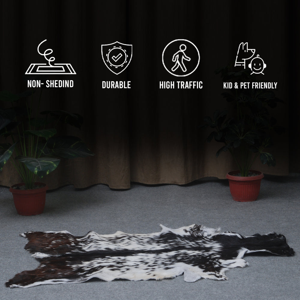 Embrace the beauty of nature with a one-of-a-kind black and white goat skin rug. Each rug boasts unique colour variations, creating a stunning statement piece.