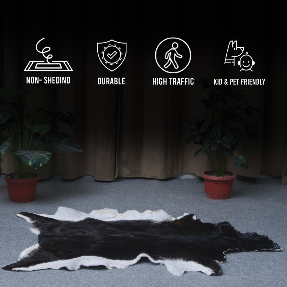 Elevate your room’s aesthetic with our eye catching black and white Goat Skin Rug. Its bold graphics design exudes modern sophistication and adds a touch of elegance to any décor. Soft and gentle on the Goat skin rug, it’s also kit and pet friendly, making it a practical choice for any household. Plus, its hypoallergenic and non- shedding properties ensure a lifetime of effortless style.