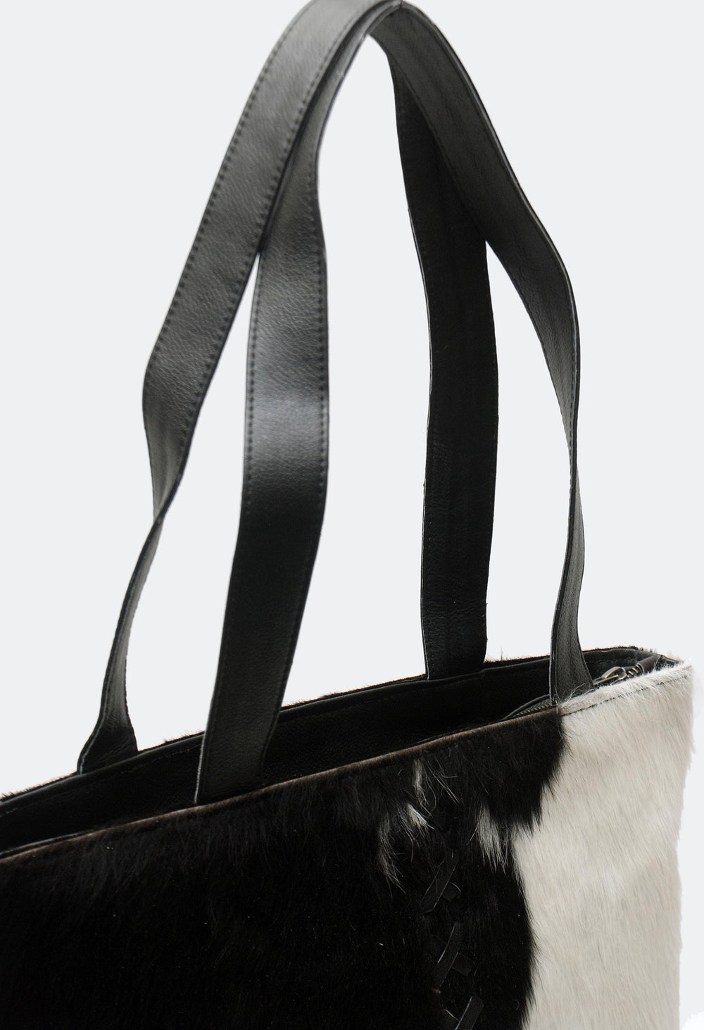 This 100% handmade cowhide shoulder bag is made in South Asia with a genuine cowhide exterior. The bag features a black and white design with natural animal print variations, making each piece unique.