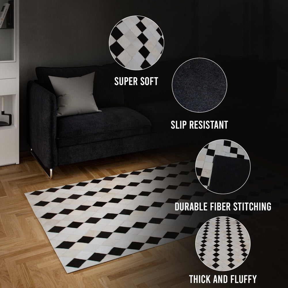 Add a touch of luxury to any room with this unique cowhide patchwork rug! Made from real cowhide leather, this rug is not only a beautiful addition to your home décor but also practical for covering up messy areas. The contrasting combination of small cowhide pieces and finished leather gives this rug an exquisite look.