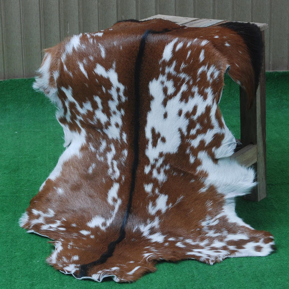 Embrace the beauty of nature with a one-of-a-kind dark brown and white goat skin rug. Each rug boasts unique colour variations, creating a stunning statement piece.