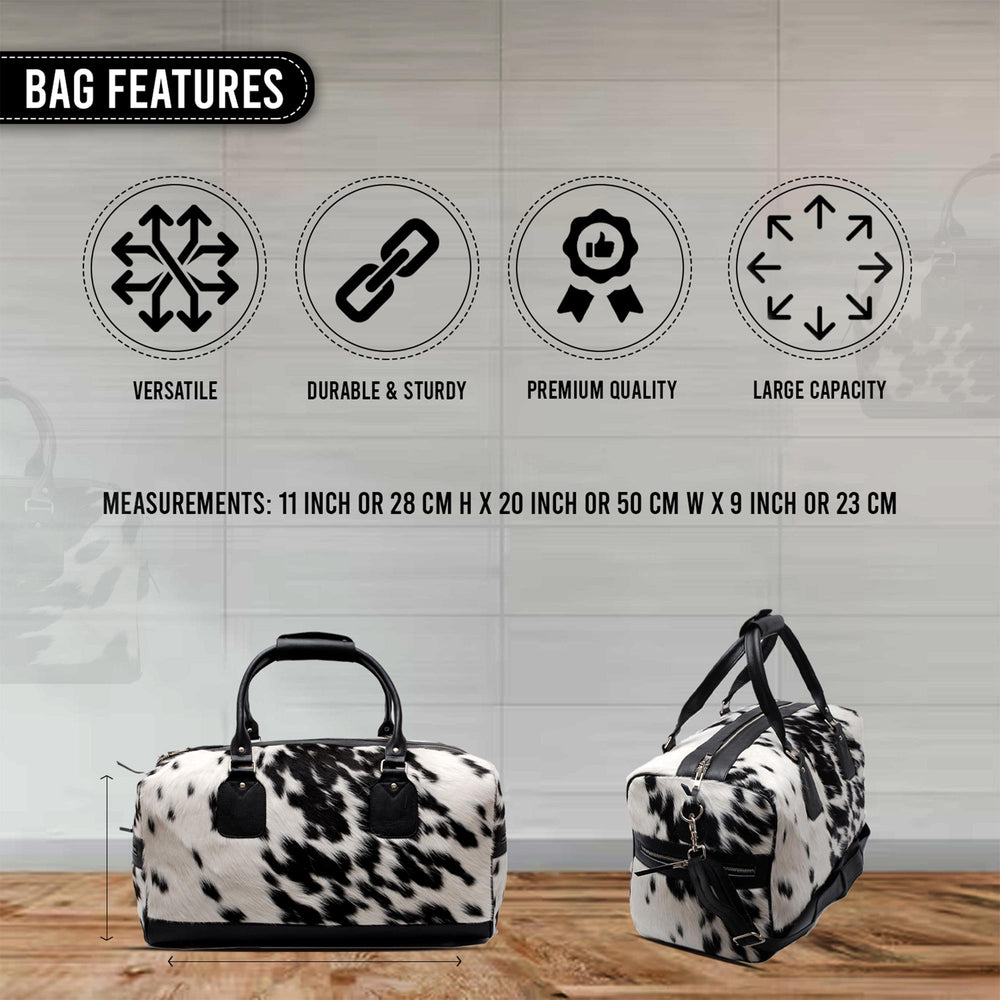 This premium Cowhide Duffle is meticulously crafted from genuine cowhide leather with rich, natural grain and real cowhide hair. The bag’s black and white color is a result of hand-selected hair-on-hide, paired with full-grain leather accents for a timeless look. Designed with both style and durability, this duffle is made from top-grain cowhide leather and expertly tanned cowhide hair.